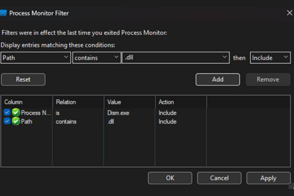 - Thêm điều kiện: Process Name – is – dism.exe – Include và Path – contains – .dll – Include.
